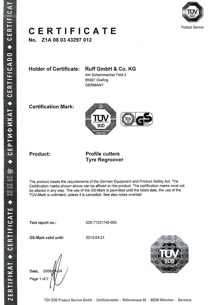 В разделе сертификаты Вы можете увидеть международный сертификат стандарта качества TUV на машинки-регруверы для нарезки протектора и лезвия «RUFF». TUV CERTIFICATE на машинки-регруверы для нарезки протектора и лезвия «RUFF» до 21.04.2013.