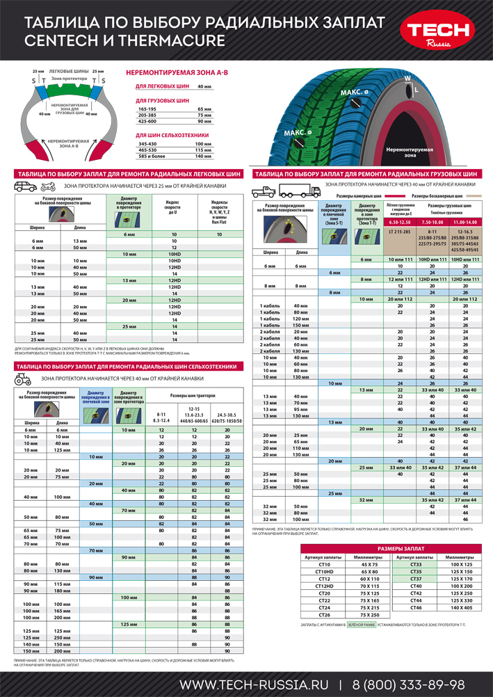 Заказывайте новый плакат с таблицами по выбору заплат TECH CENTECH и THERMACURE для ремонта радиальных шин.