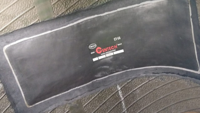 В месте повреждения были установлены радиальные заплаты СТ-56 (192BK) размером 745 x 260 мм. Для вулканизации сырой резины применялся вулканизатор Комплекс 3.