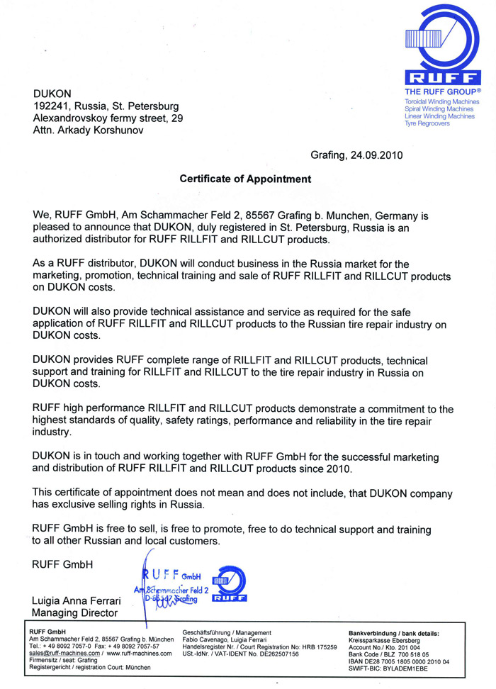 В разделе сертификаты Вы можете увидеть письмо о том, что «ДЮКОН» - авторизованный дистрибьютор компании «RUFF» (машинки-регруверы для нарезки протектора и лезвия) в России.