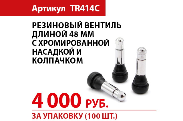 Резиновый вентиль, EPDM с хромированной насадкой и колпачком для б/к дисков легковых автомобилей и микроавтобусов, диаметр отверстия в диске 11.3 мм, длина 48 мм, 100 шт, арт. TR414C за 4 000 рублей.