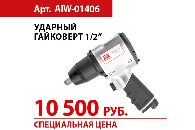 Гайковерт ударный 1/2 дюйма, усилие 813 Нм, 6500 об/мин, корпус из сплава алюминия и композита, вес 2,8 кг, Арт. AIW-01406 за 10 500 рублей.
